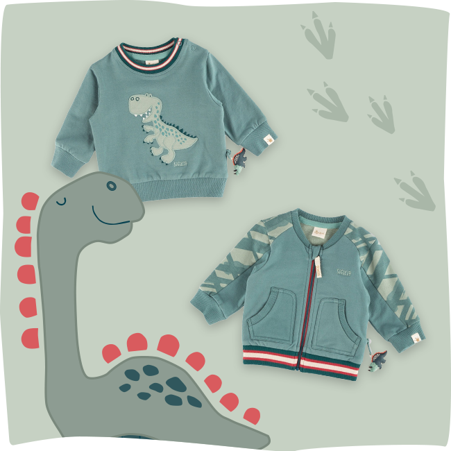 Orange-coloured 3-D dino spikes at one side and a triceratops soft toy mascot attached to the other side reveal that this baby sweatshirt is part of our Dino World series. Quality: The stretchy sweatware consists of organic cotton and lycra, softly brushed inside. As our children's wear is always colour-coordinated, we offer matching trousers, too! For example look for those plein green sweat pants with ankle cuffs in the same colours as this sweatshirt's neckline. Discover our complete collection.